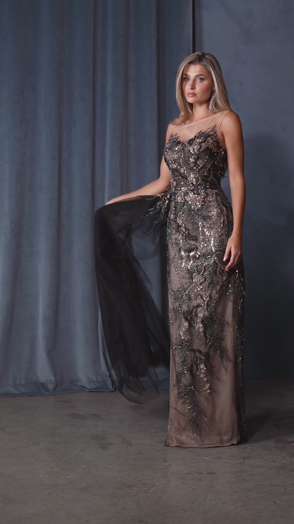 This fitted gown exudes a captivating allure with its illusion neckline and intricate sequin embroidery layered over a nude mesh base. The shimmering beadwork creates a dramatic, sculpted effect that enhances every curve, while a cascading side tulle drape adds dimension and movement.