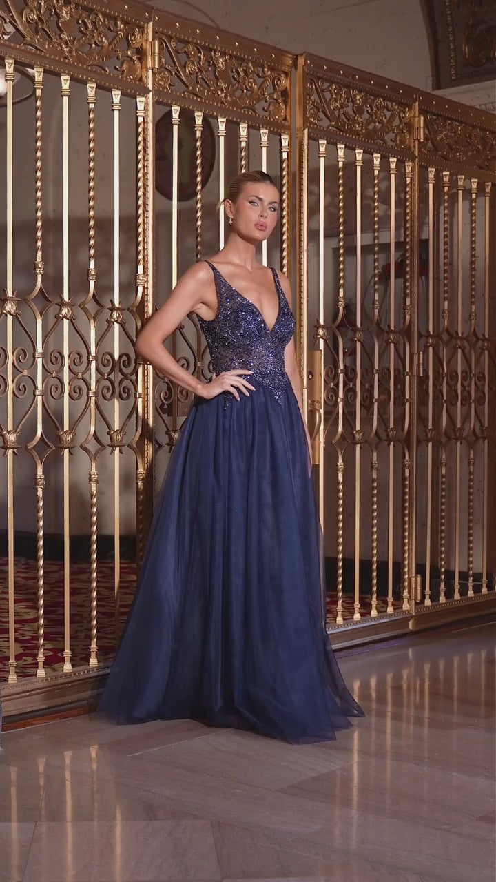Designed for timeless enchantment, this A-line gown showcases a deep V-neckline and a shimmering, beaded bodice that catches the light with every movement. The structured top melts into a full layered tulle skirt, creating a dreamy, princess-like silhouette. With a flattering low back and delicate sparkle throughout, this gown blends elegance and glamour—perfect for galas, prom nights, and formal events.