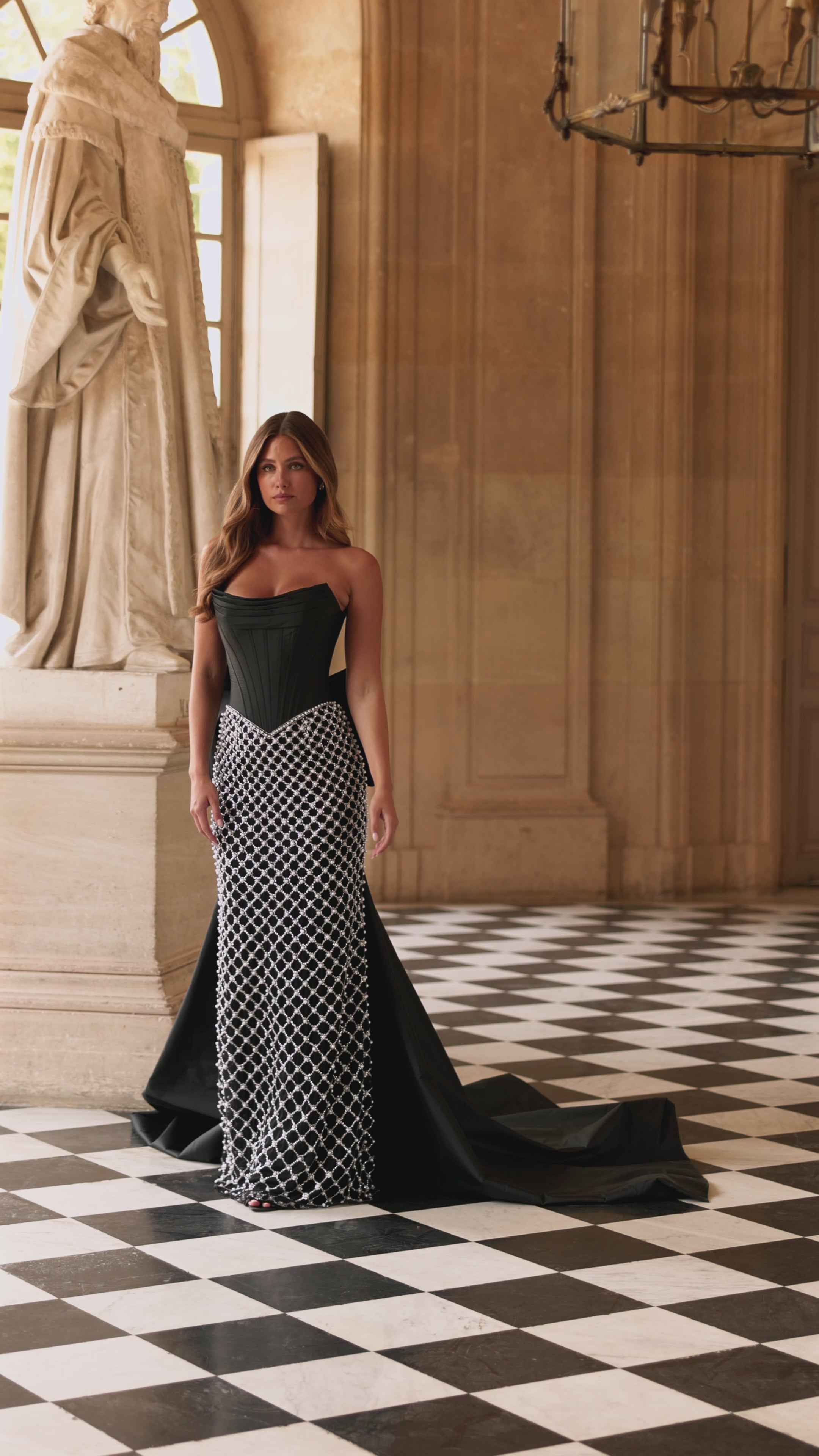 Strapless fitted gown with corset bodice and beaded pearl skirt with detachable bow.