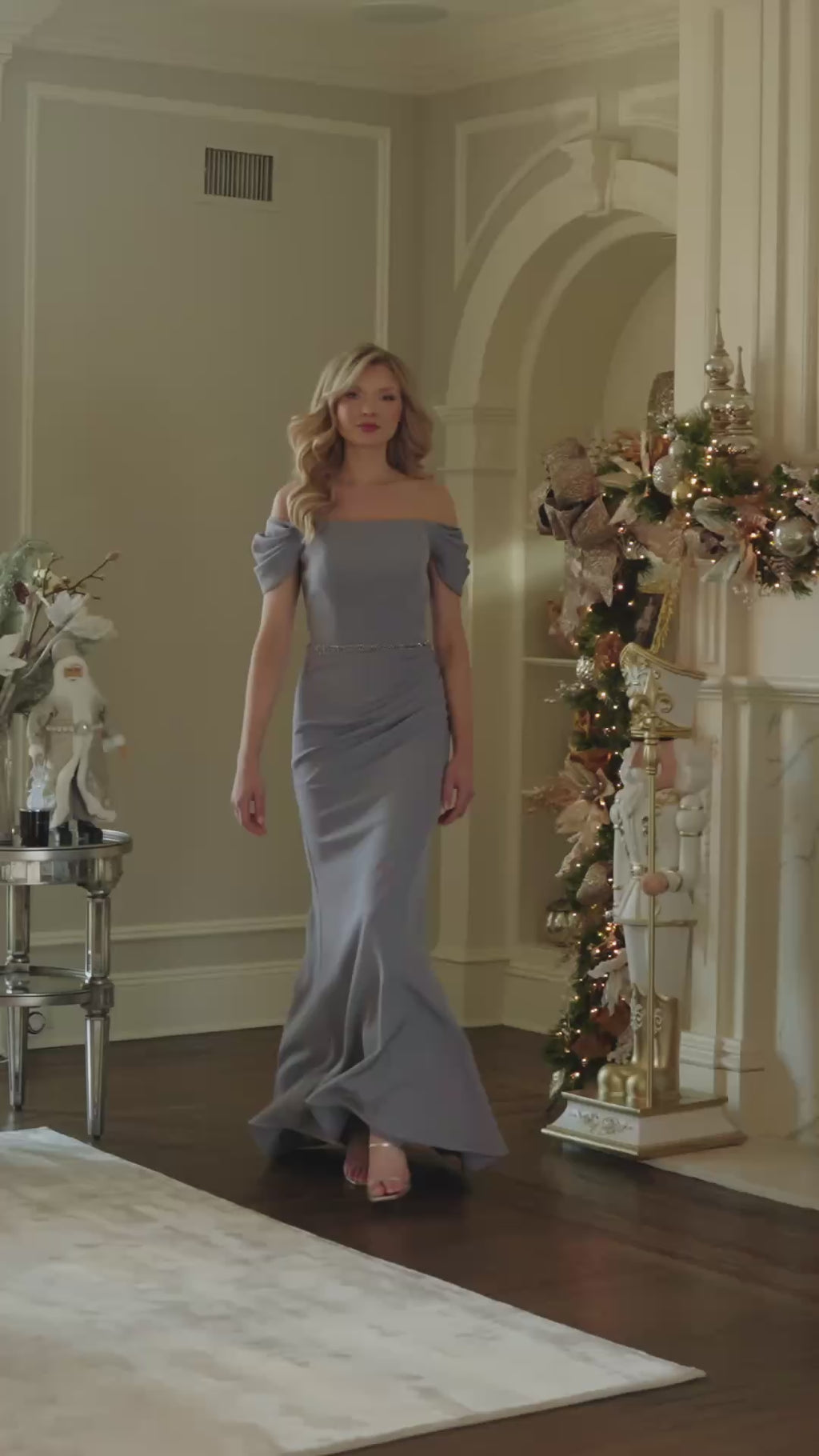 This off-the-shoulder stretch crepe gown features elegantly pleated draped sleeves and a crystal-beaded embellished belt, available in Grey, Mauve, and Midnight Blue.