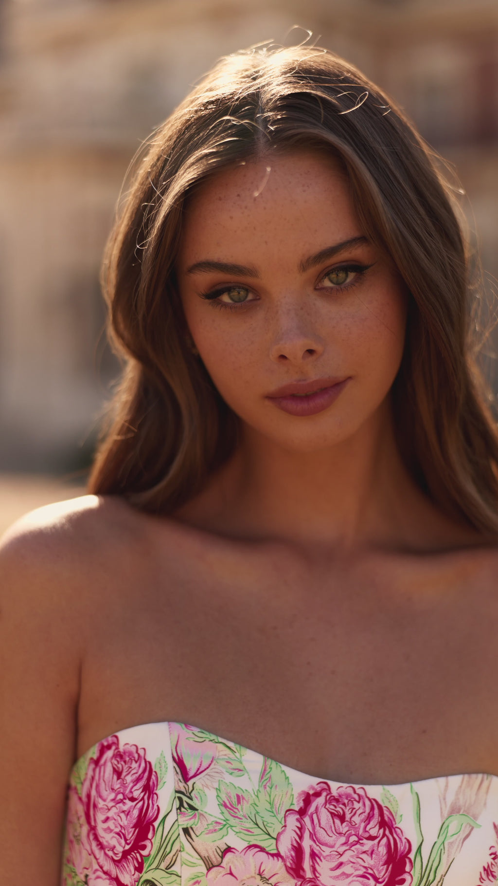 Strapless floral gown with bow on hip.