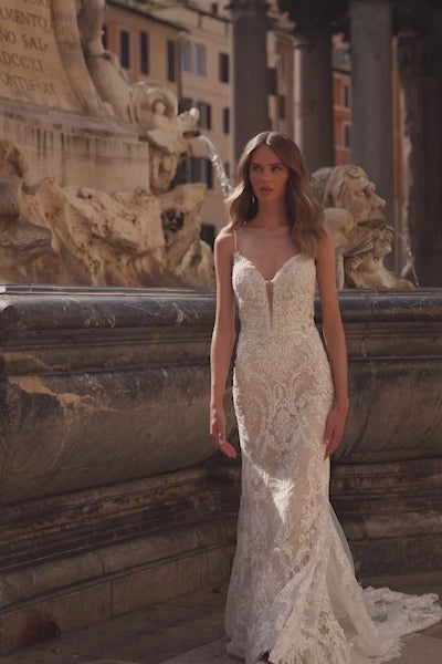 A stunning gown featuring delicate lace and intricate embroidered appliqués. It has a plunging V-neckline, illusion bodice, and a low open back for a touch of romance. The chapel-length train adds an elegant finish, making this gown perfect for a memorable bridal look.
