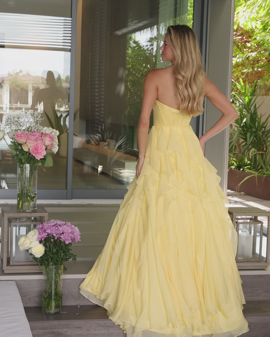 Ava Presley 42209 This stunning strapless gown seamlessly blends elegance with movement. The structured bodice provides flattering support while a delicate front bow detail adds a refined finishing touch. Crafted in flowing chiffon, cascading ruffles create romantic dimension throughout, as the A-line silhouette offers graceful silhouette.