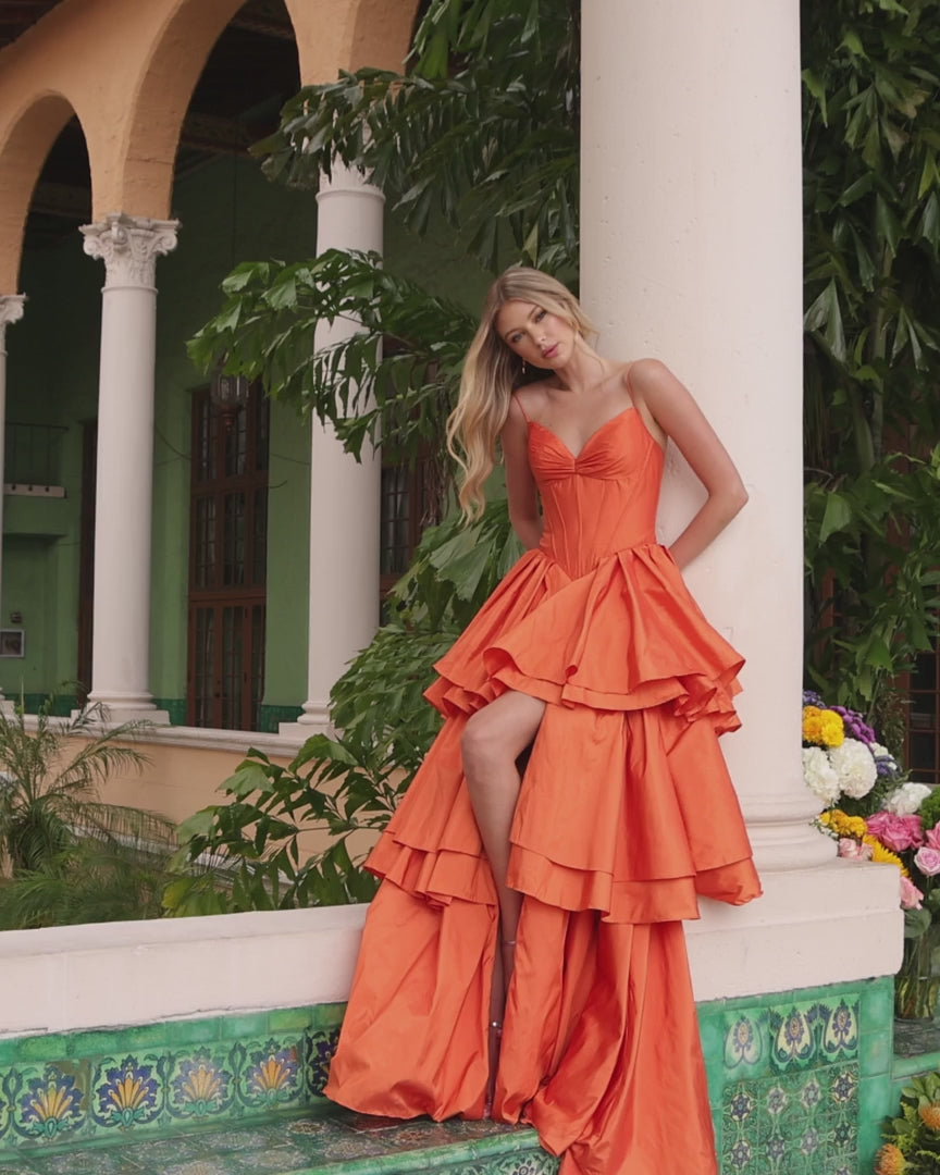 Ava Presley 42322 is a striking high-low ball gown featuring a sweetheart neckline, structured bodice, and tiered skirt with dramatic train. The high front slit creates an elegant yet daring look, perfect for pageants and formal events.