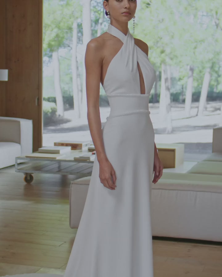 Simple two-piece sheath-style wedding dress, with beadwork details. Featuring a halter neckline and open back with a georgette cape. An on-trend Rosa Clará set.