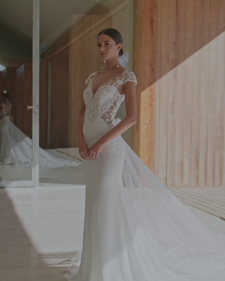 Sexy two-piece mermaid wedding dress, crafted in stretch crêpe combined with lace and beadwork. With a sweetheart neckline, V-back, short sleeves and a train in lace and beadwork. Complete with a detachable train in tulle. A dreamy Rosa Clará set.